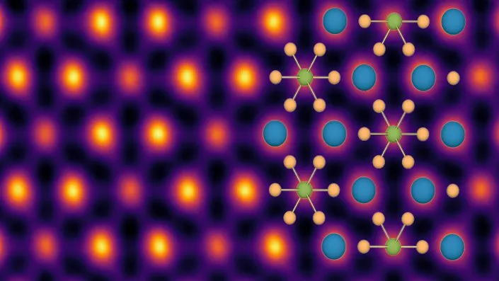 Questa immagine al microscopio elettronico a scansione (SEM) ad alta risoluzione dei cristalli BaTiS3 è sovrapposta con illustrazioni che mostrano l’orientamento dei singoli atomi nel cristallo. Nonostante la perfezione atomica del cristallo, è inaspettatamente povero nel trasporto di energia termica.Credito: Caltech / USC / ORNL