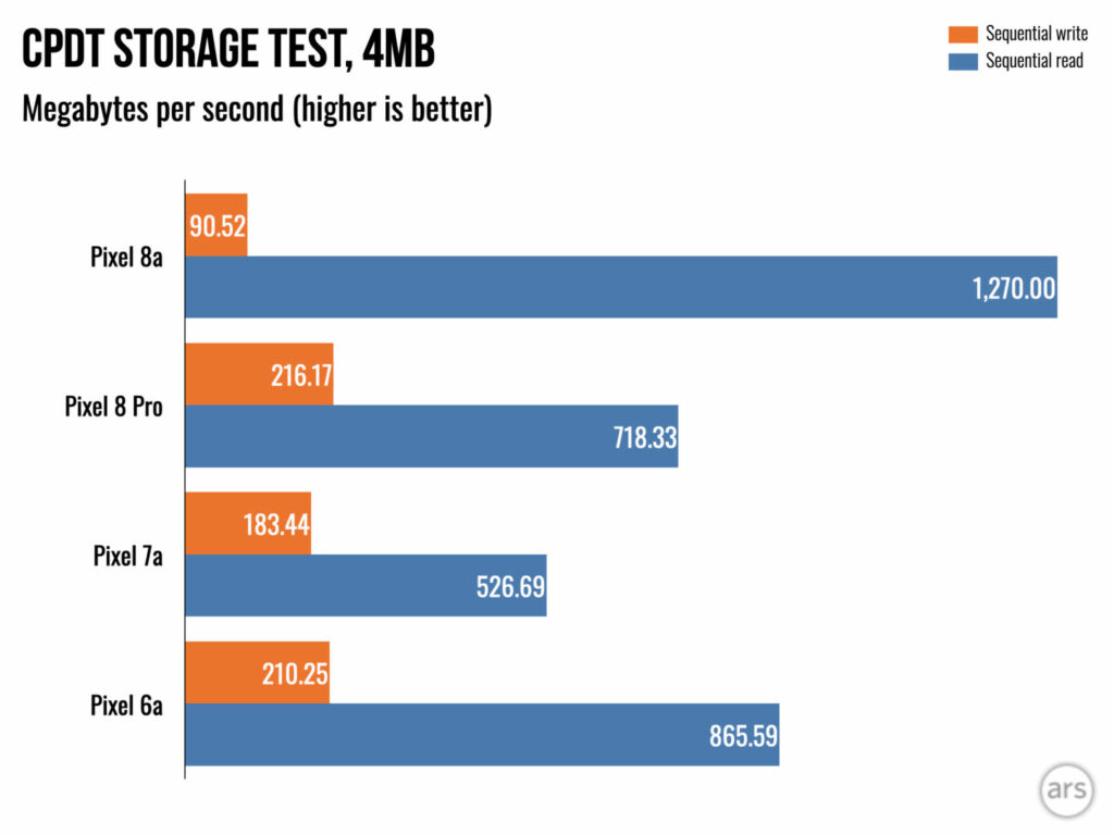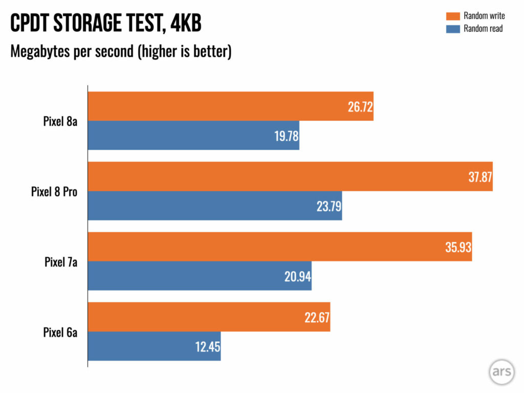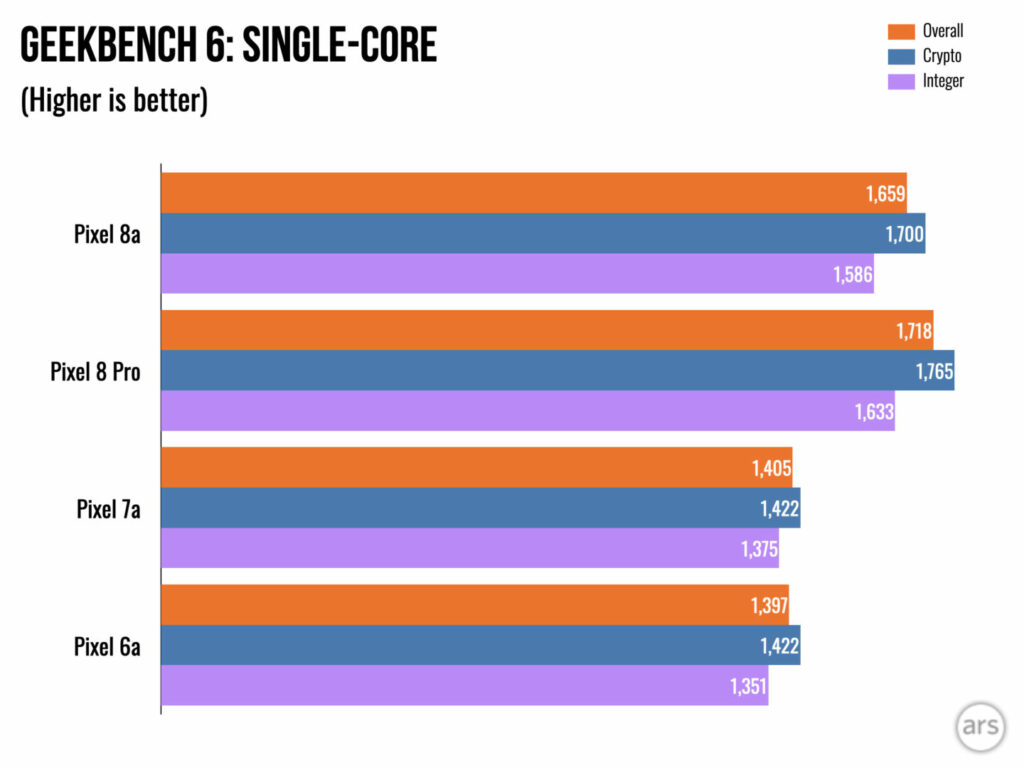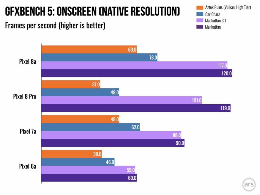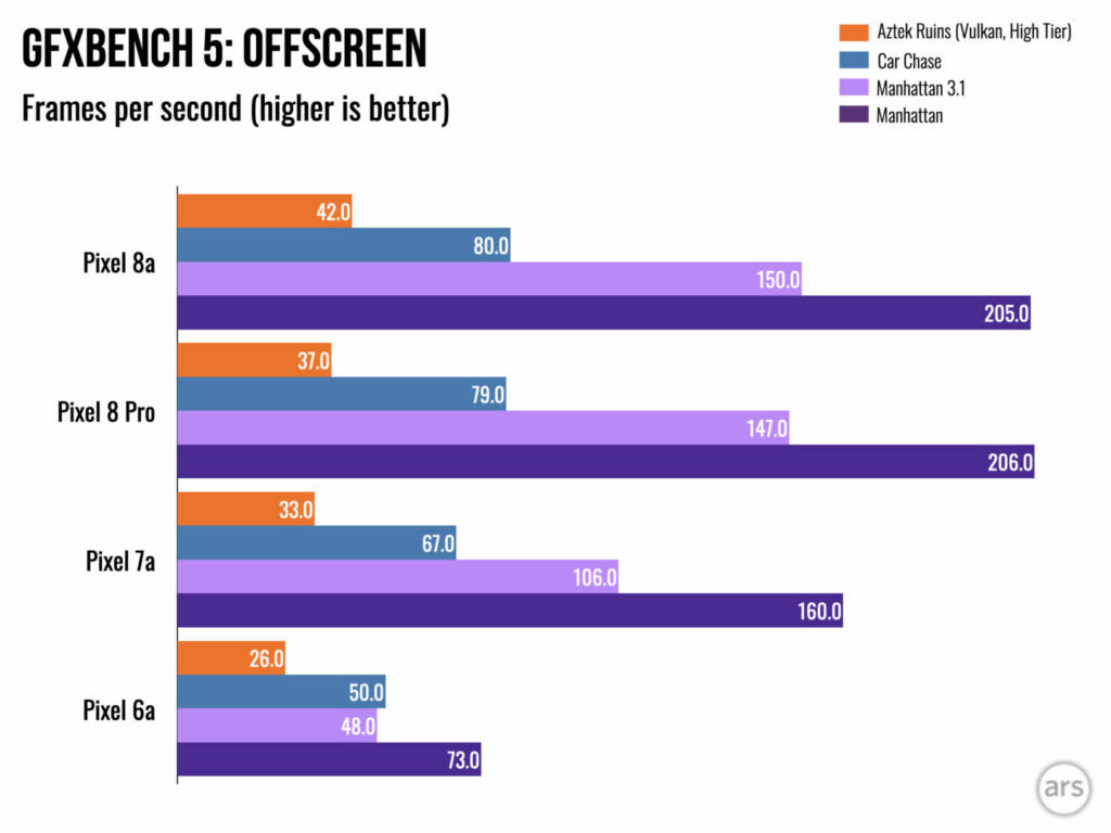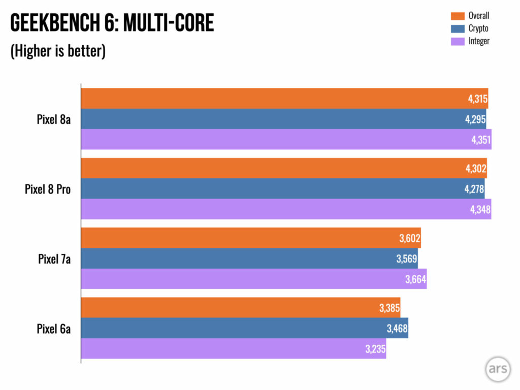 Il Tensor 3 è lo stesso dei flagship Pixel 8 più grandi, tranne per il fatto che utilizza un metodo di confezionamento più economico e più caldo. Per questo motivo (o per il suo raffreddamento più economico), Pixel 8a rallenterà di più rispetto a Pixel 8 Pro. Faranno lo stesso benchmark mentre sono interessanti, ma dopo aver eseguito circa 20 minuti di benchmark, Pixel 8 Pro mostrerà circa 4000 in multicodice Geekbench mentre l’8a sarà a 3500. Si tratta ancora della velocità di un telefono del 2023 , quindi non è la fine del mondo.