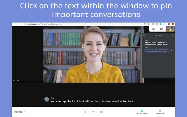 È qui che arriva l’estensione Tactiq Pin per Google Meet per Chrome. Puoi utilizzare questa estensione per salvare le trascrizioni in tempo reale e leggerle in tempo reale. Puoi aggiungere conversazioni importanti in modo da poterle trovare in un secondo momento e anche salvare le trascrizioni negli appunti, come file TXT, su Tactiq o caricarle su Google Drive.